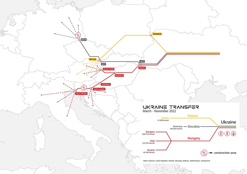 Az RCG március óta jelentős mértékben támogatja Ukrajnát mezőgazdasági termékek fuvarozásával és logisztikai szolgáltatásokkal. Ennek eredményeként 2022. november végéig már több mint egymillió tonna gabonát továbbított Ukrajnából Közép- és Dél-Európába. Az RCG rendelkezésére álló információk szerint ezzel a teljesítménnyel az ÖBB árufuvarozó leányvállalata élen jár Európában. A fuvarozott mennyiség havonta 100–150 ezer tonnát tesz ki, amelynek keretében elsősorban gabonát és kukoricát, illetve cukrot és olajrepcét szállít a vállalatcsoport. A fő célországok Magyarország és Németország, amelyeket Olaszország és Ausztria követ. A március óta leközlekedtetett mennyiségek és az útvonalak a grafikonon láthatóak.