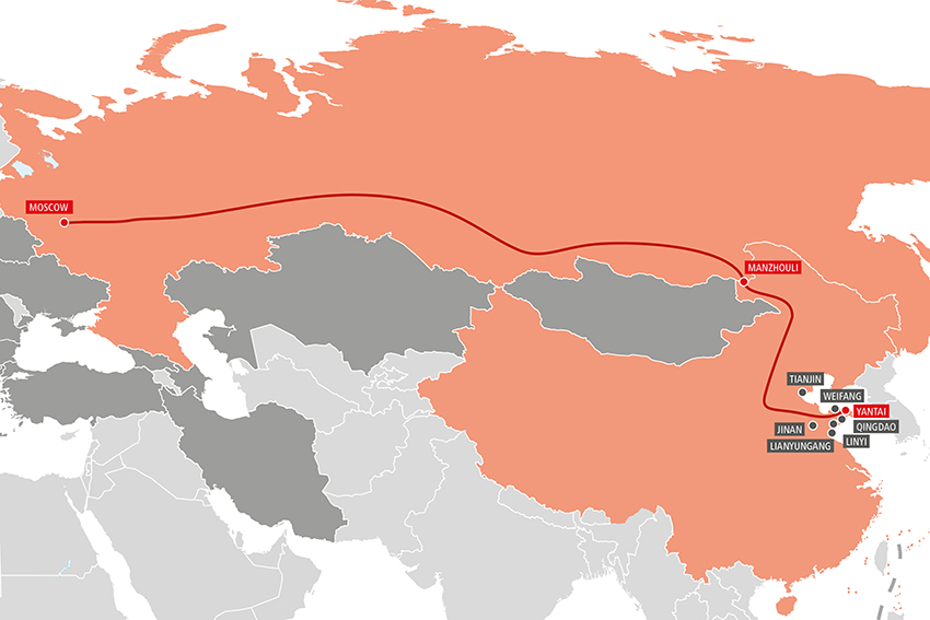 | Yantai–Moskau | Zabaikalsk/Manzhouli | FCL | 14 - 16 | Itinerar Hartă |